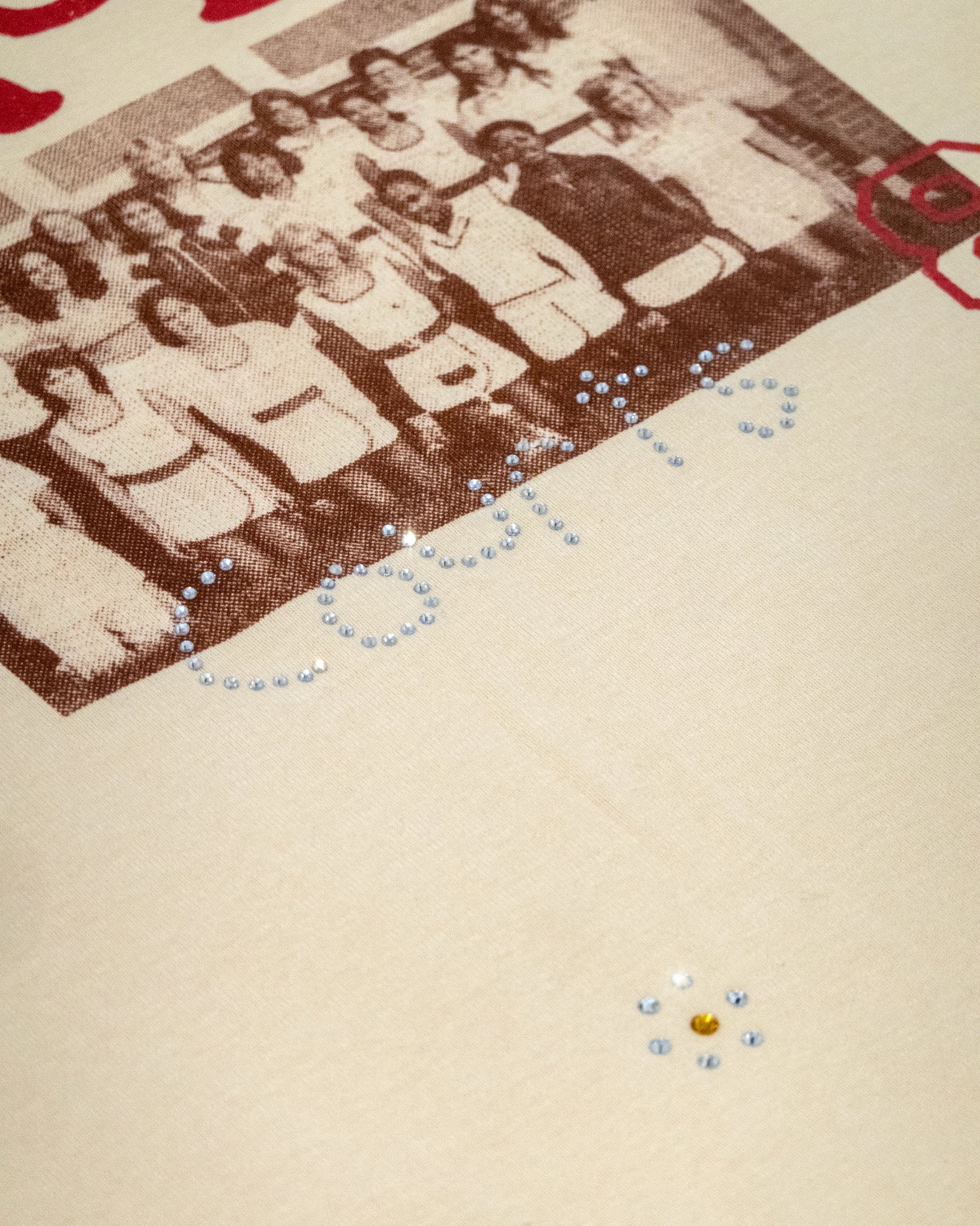 Brown and red screen print on cream tee with hand-embellished rhinestone detail